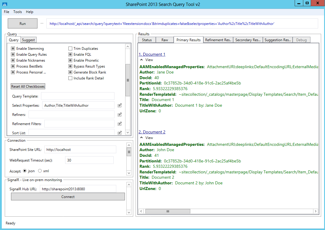 For my example, I uploaded two different documents for two different users: John Doe and Jane Doe. You will want to upload some Microsoft Word documents (.docx) in order to test and then perform a full crawl. After the crawl is complete, check the log and make sure there are no errors related to content enrichment. If you happen to be debugging and stepping through code, you might receive errors if you run past the defined timeout of 30 seconds; when you done debugging, be sure to run a fresh, untouched crawl before viewing your results. Once items have been processed successfully, you should see the new managed property as seen in Figure 2. On a side note, if you are working with search and do not have the SharePoint 2013 Search Query Tool, I highly recommend it: http://sp2013searchtool.codeplex.com.