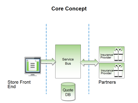 Let us assume that we are building a website that provides insurance quotes to its users. This website is itself an e-commerce aggregator that in turn relies on one or more underwriters to provide quotes based on the data submitted by the user. You can quickly see why loose coupling would be good for an application such as this. We want the ability to dynamically add/remove underwriting partners. We also want a robust setup for interaction between the website and the underwriting partners so that a failure of one of the partners does not adversely impact the overall application. Certainly the ability to scale with load is going to be important for an e-commerce aggregator. Additionally, each underwriting partner may have a slightly different view of the data fields that make up a quote. So we want our persistence store to support dynamic schema. Finally, we may want to add new insurance products (home, cycle or cyber) in the future.