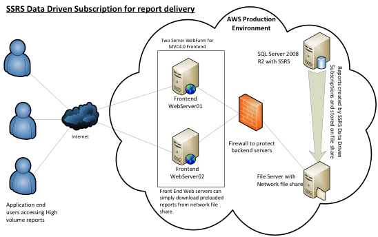 We created data-driven subscriptions for all high-volume SSRS reports and then provided end users with options to download these reports. High-level solution architecture is shown below: