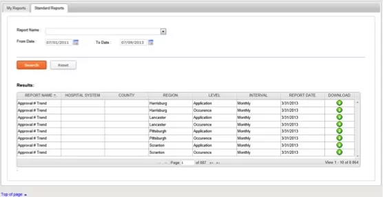 - Download web page: A simple MVC webpage, as shown in the screenshot below, was created for the report download purpose. This page first authenticates users based on their logins and then allows users to download the Excel files according to their access levels. With this solution in place, there was no load on SQL Server and end users were able to get all high-volume reports (sometimes as big as 80MB) within two minutes. The download webpage did not have any timeout errors as the download started as soon as a user clicked on the download link. SQL Server and SSRS were not involved in this process.