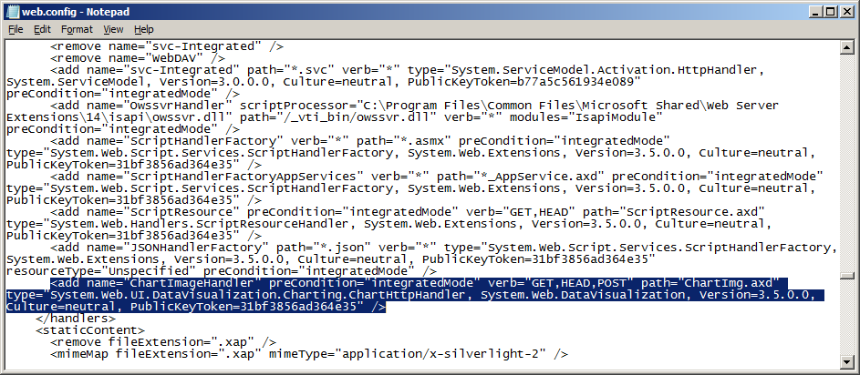 One of the modifications that I needed to add was for MSChart. I will use that as an example. In the script you will see that for each SPWebConfigModification I am setting a Path, Name, and Value property. The Path property is a path to the node in the web.config file that you would like to add your modification to. The Name property gives the modification a unique name when it is stored. The following convention must be used to ensure that the Name property is unique and that it will not be duplicated when it is applied to the web.config: