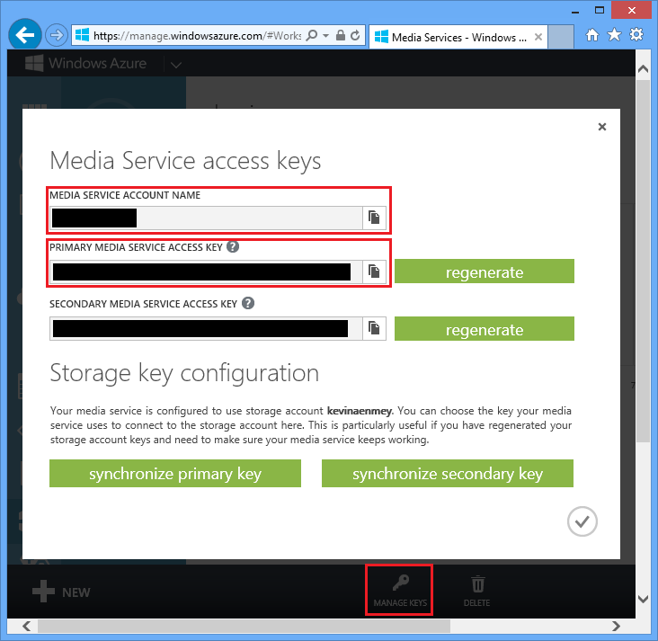 , you will need to pass in your WAMS account name and access key. You can find these in the Azure Portal (manage.windowsazure.com). In the portal, click Media Services, select the Media Services account you created in Step 1 and click Manage Keys.