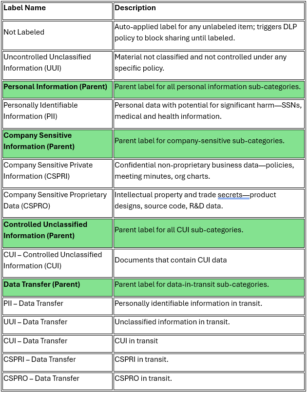 Sensitivity labels let organizations classify and protect data by applying a consistent tag (e.g., Confidential, CUI, SPI) that drives encryption, access policies, and sharing restrictions. In a M365 GCC High tenant, used by Department of Defense contractors and federal agencies, labels map directly to Controlled Unclassified Information (CUI) categories and organizational data naming policies. Without labels, sensitive materials can slip through uncontrolled channels, risking non-compliance with DoD standards. By designing a label taxonomy that’s aligned with a client’s policy, we ensure every email or document is tagged, protected, and audited according to the required classification.