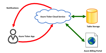 The Azure Ticker App submits the credentials for the Azure subscription to be monitored, along with the channel URL for receiving notifications, to an Azure Cloud Service. The Azure Service is in turn responsible for periodically checking the account balance and sending out notifications if needed.