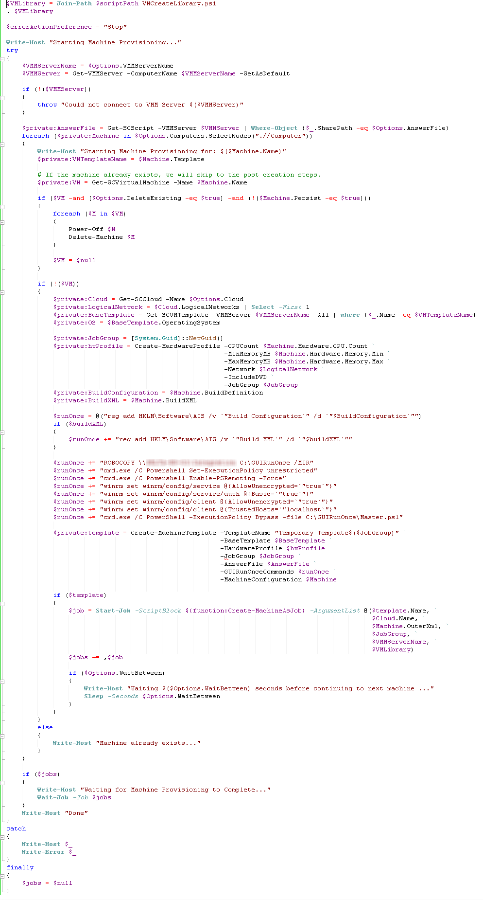 In the above function, we actually loop through a series of XML elements where each element represents a machine. As we do this, we look for any existing machines by that name and remove those. (This functionality can be overridden using Persist=”true” on the machine element or by setting DeleteExisting=”false” on the Provision-Environment element).