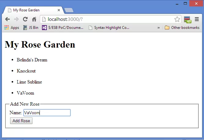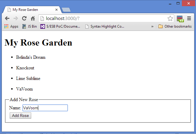Let’s finish our excursion into Meteor by adding an input field and button that will allow us to add a rose through the user interface. Update the html page to add a form: