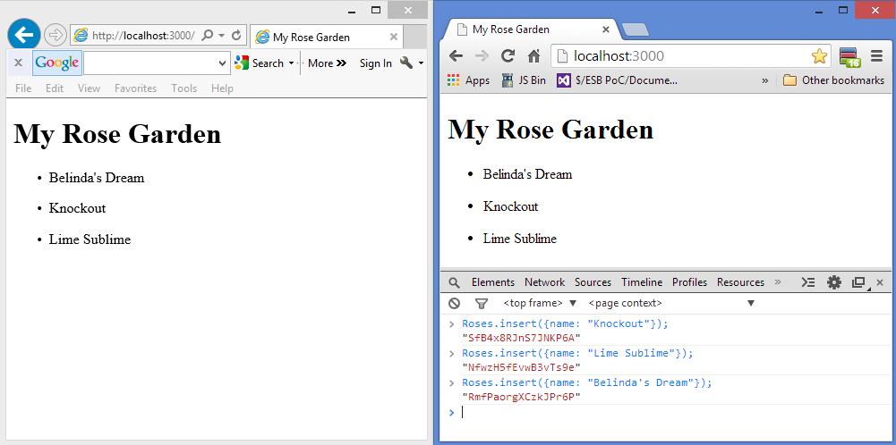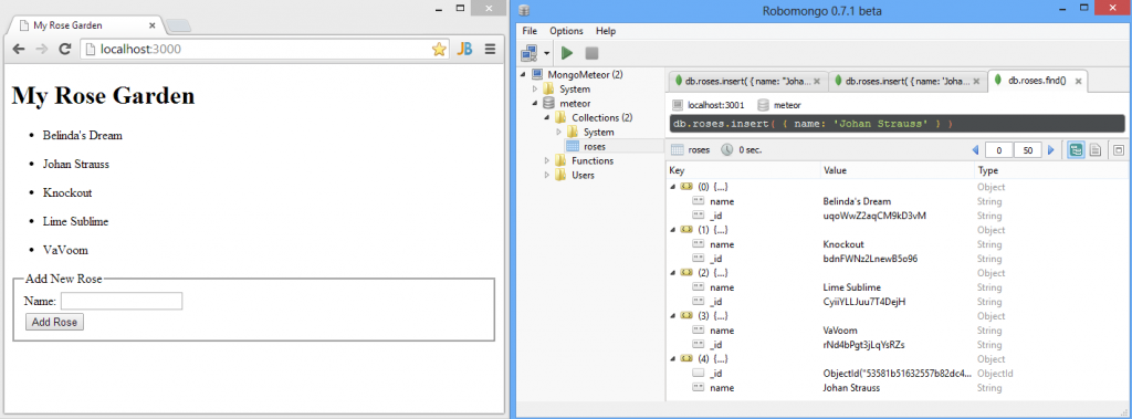 Meteor responds to more than updates on the page. It responds to any change made in the Mongo database, whether initiated on the page or outside of it. To demonstrate I am using a tool called RoboMongo to enter an insert of another rose directly into Mongo: