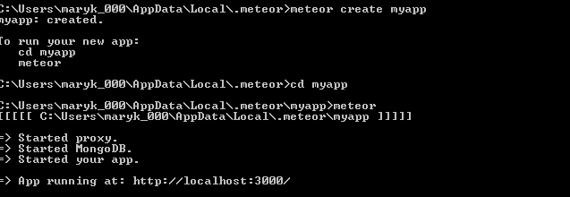 Getting started with Meteor is straightforward. For this article, we’ll use the Windows version found at https://github.com/sdarnell/meteor/wiki/Windows . While this version is not officially part of Meteor, Windows support is on the road map for future releases. Click on the installer that you find on that page. Once the installer completes, open a command prompt and navigate to the directory it creates in your AppData local folder – %AppData%\Local\.meteor.