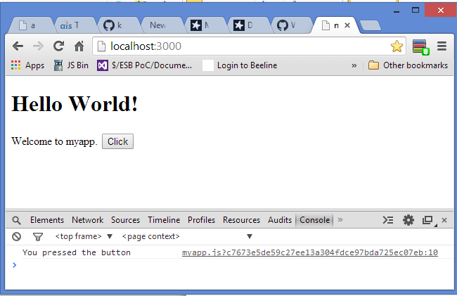 If you open a console in the developer tools in Chrome or IE and click on the button you’ll see a message echoed back to you.