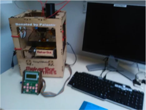 This is the popular 3-D printer MakerBot. It can “print” a 3-D object using layers of melted plastic. 3-D printers used to cost tens of thousands of dollars just a few years ago. But now you can get one for close to $1,000.