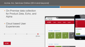 In envisioning the future of Acme Inc, we took an approach of augmenting existing products immediately with a set of cloud-based features. By delivering new, innovative features immediately and measuring customer experiences, Acme begins learning what opportunities match their customers expectations in this new space. As experiments turn into hard experiences, Acme can deliver incremental advancements much like our Lean Startup brethren.