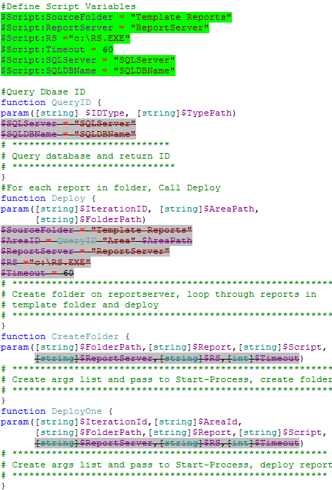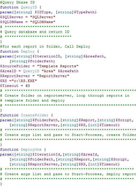 Granted, this script file has several functions: A database lookup to get some parameter values, a loop through the report template folder to get the names of reports to deploy, a function to create the destination folders on the report server and a function to deploy each report. (I realize there are probably better ways to pull off these tasks, but since this is my first PowerShell project, just go with it.)