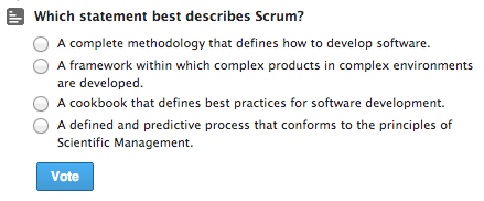 While the poll question may be a bit leading, I was incredibly happy to see that the results of the Yammer poll shows 91% of our team recognizes Scrum as a framework within which they can solve complex problems in smart, creative ways. Something that our clients have come to expect from AIS.