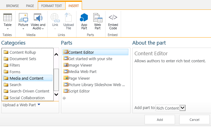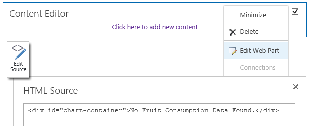 Edit the CEWP, place your cursor in the “Click here to add new content” text, and click the “Edit Source” button in the ribbon. Type in the html for your div container, using the ID that is referenced in your chart rendering function, then click OK. Save the CEWP by clicking OK when you are done.