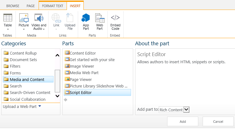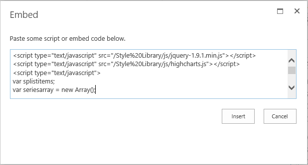 Add a Script Editor Web Part to the page. Click on “EDIT SNIPPET”, paste in all the script code you have prepared, and click Insert. Save the Script Editor Web Part by clicking OK when you are finished.
