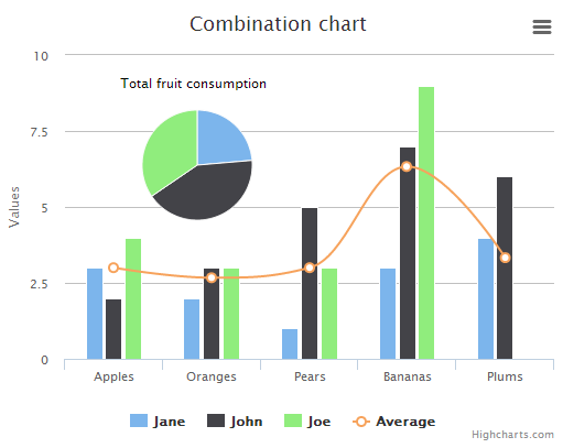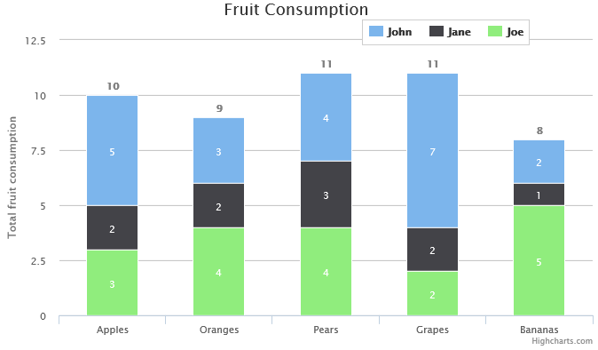 function DrawChart() { fruitChart = new Highcharts.Chart({ chart: { renderTo: 'chart-container', type: 'column' }, title: { text: 'Fruit Consumption' }, xAxis: { categories: ['Apples', 'Oranges', 'Pears', 'Grapes', 'Bananas'] }, yAxis: { min: 0, title: { text: 'Total fruit consumption' }, stackLabels: { enabled: true, style: { fontWeight: 'bold', color: 'gray' } } }, legend: { align: 'right', x: -70, verticalAlign: 'top', y: 20, floating: true, backgroundColor: 'white', borderColor: '#CCC', borderWidth: 1, shadow: false }, tooltip: { formatter: function() { return '<b>'+ this.x +'</b><br/>'+ this.series.name +': '+ this.y +'<br/>'+ 'Total: '+ this.point.stackTotal; } }, plotOptions: { column: { stacking: 'normal', dataLabels: { enabled: true, color: 'white', style: { textShadow: '0 0 3px black, 0 0 3px black' } } } }, series: seriesarray }); }