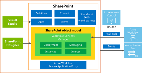 Fortunately, no, that’s not the case. While I’m sure there will be a model for this, it’s not the only one. You can host WAW on-premises just like SharePoint. We’ll delve into that momentarily. Windows Azure Workflow is built on Windows Workflow Foundation 4.5 (WF4.5). WF4.5 introduces several new features as detailed in the MSDN article “What’s New in Windows Workflow Foundation.” This will require a separate install that can run on a SharePoint server or its own environment. We’ll also look at the architectural implications in a bit.