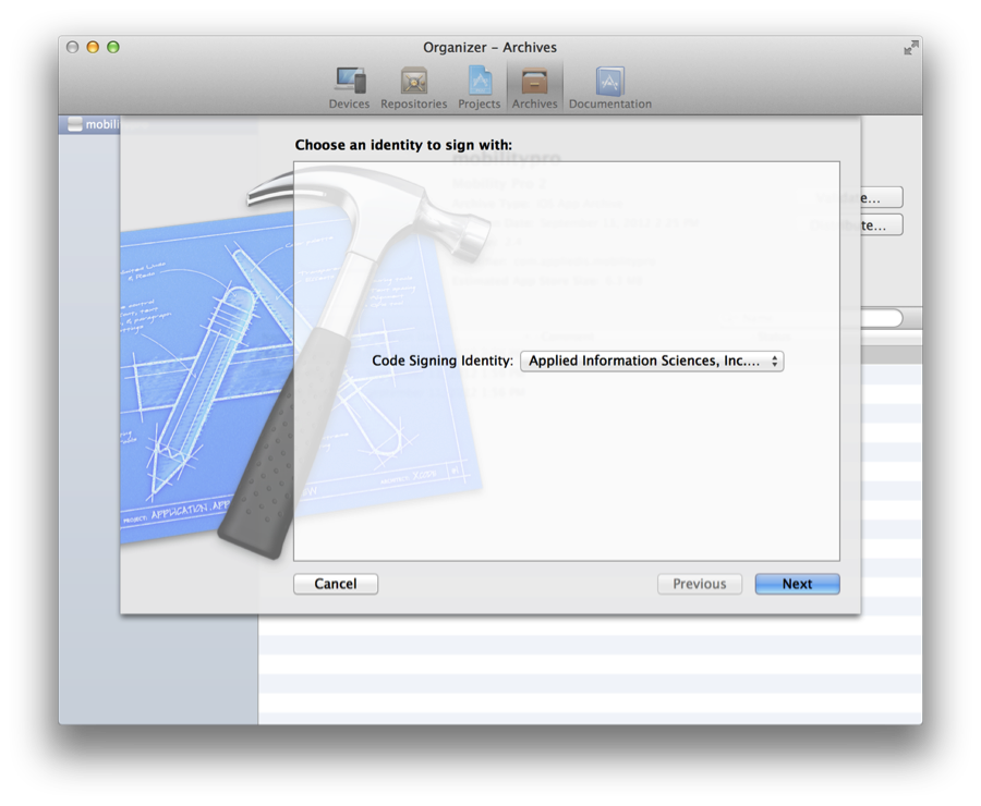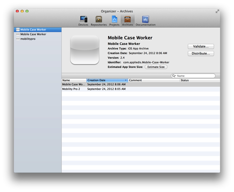 Upon successful completion of the archive process, Xcode’s Organizer will come up, listing all of the archives created for your apps. This is where you will actually create the distribution objects. But before you take that step…