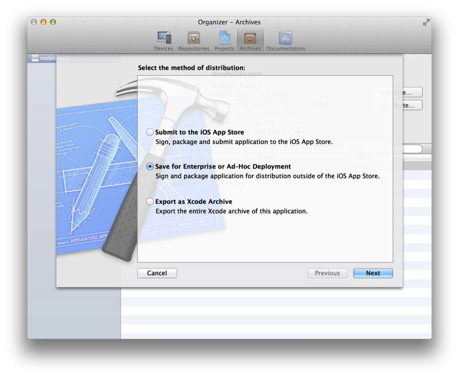 Select “Save for Enterprise or Ad-Hoc Deployment” and click “Next”.