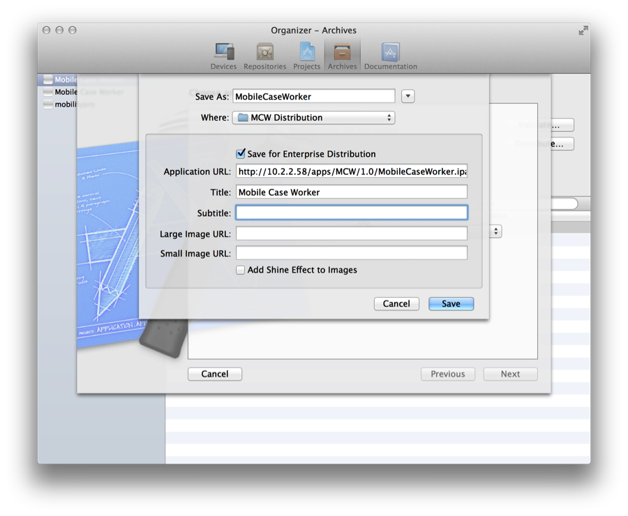 Give your distribution package a name, and make sure you select “Save for Enterprise Distribution”. The fields for Enterprise Distribution will appear. Fill out Application URL with the exact path (including the domain name and the ipa file name, including extension), as determined in the previous step. Thus, for this example, the path would be http://10.2.2.58/apps/MCW/1.0/MobileCaseWorker.ipa.