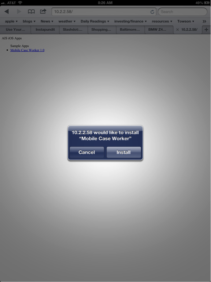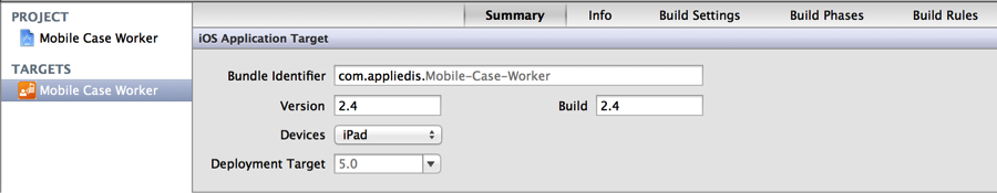 You will also need to determine exactly where on the server the ipa and manifest files will be stored. For this example, we put MobileCaseWorker.ipa and MobileCaseWorker.plist in /apps/MCW/1.0/ (making the fully qualified path for our test app distribution server http://10.2.2.58/apps/MCW/1.0/). Knowing this path is important for the next step.
